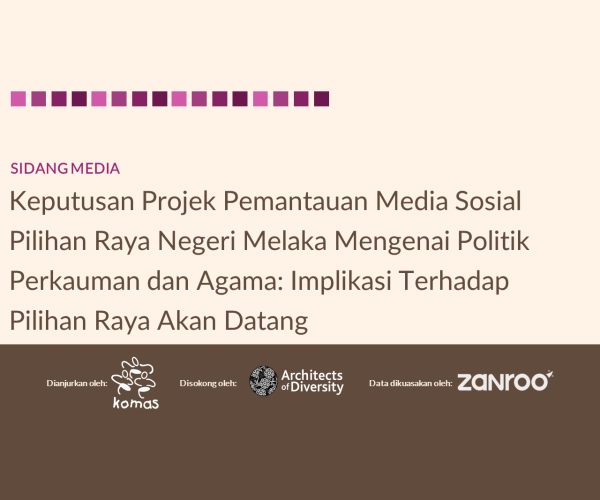 The Melaka snap election was held in November 2021 due to the ongoing political crisis. As physical gatherings were restricted to curb the spread of COVID-19, political campaigns were conducted online. Pusat KOMAS collaborated with Zanroo Malaysia to monitor social media conversations during the Melaka state elections which took place from 1 to 22 November 2021. Public conversations, statements and actions of politicians and political parties were monitored and documented to see whether there were any signs of racial and religious politics played out on social media.